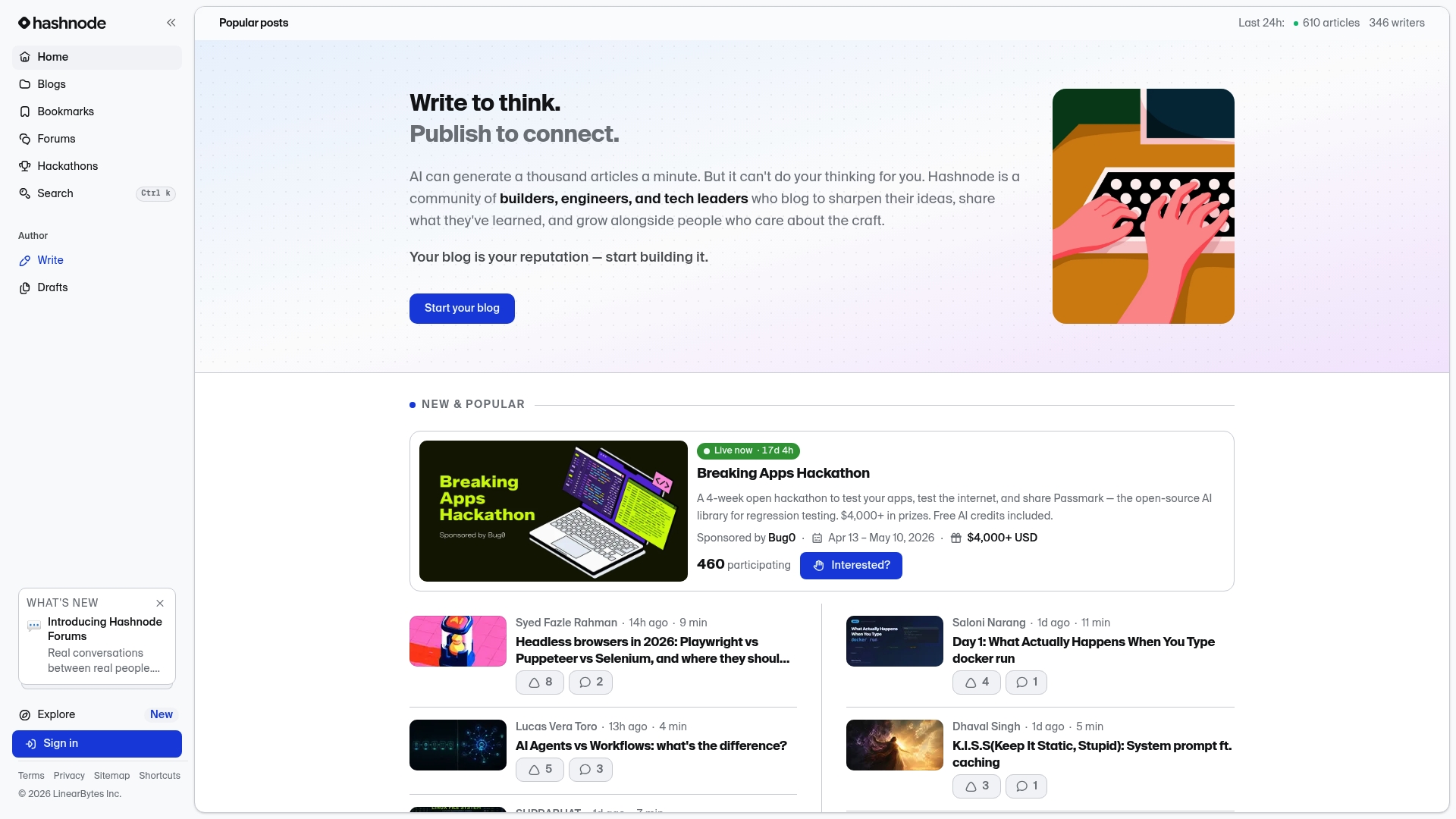 Hashnode is a focused publishing and community platform built for builders, engineers, and tech leaders who share technical writing and learn from peers. It pairs a clean blogging platform with active discussion spaces so your ideas reach practicing developers and get real feedback.