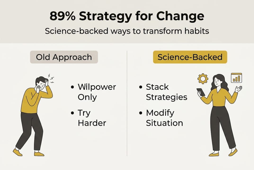 Here's a number that should shift your entire approach: 89% of the time, people successfully resist desires not through pure willpower, but by using strategies like situation modification, distraction, goal reminders, and multiple combined tactics. Willpower alone is a minority strategy, and a less effective one.
