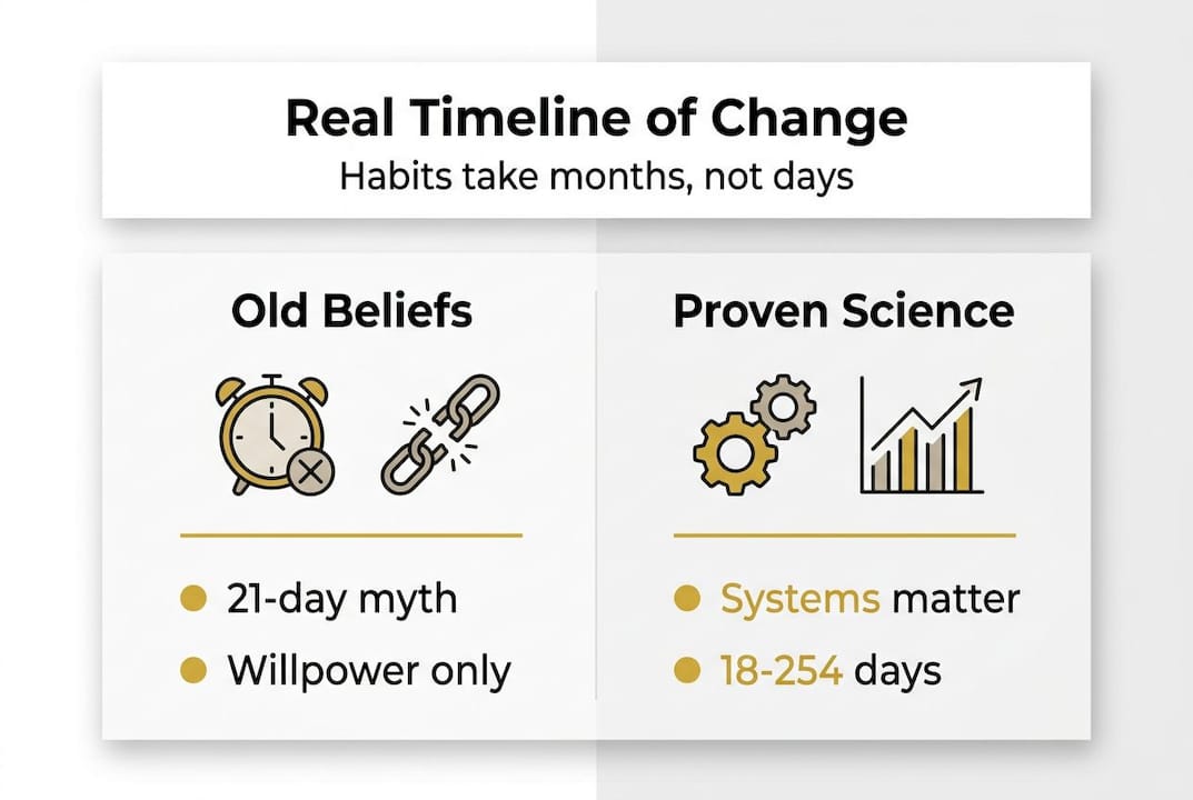 Real data tells a different story. Habit formation actually takes anywhere from 18 to 254 days depending on the person and the complexity of the behavior. The average lands around 66 days, more than three times what most programs promise.